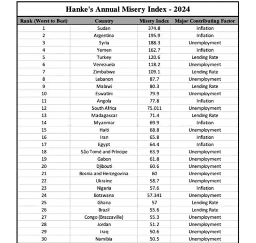 Sudan, yaşanan iç savaşın ekonomik etkileri, yüksek işsizlik ve yüzde 204,7’ye ulaşan yıllık enflasyon oranıyla listenin zirvesinde yer alıyor. Ülkedeki banka kredi oranlarının ve reel GSYH büyümesindeki negatif seyrin birleşimi, Sudan’ı Hanke’nin endeksine göre en “zor durumda” olan ülke haline getiriyor.