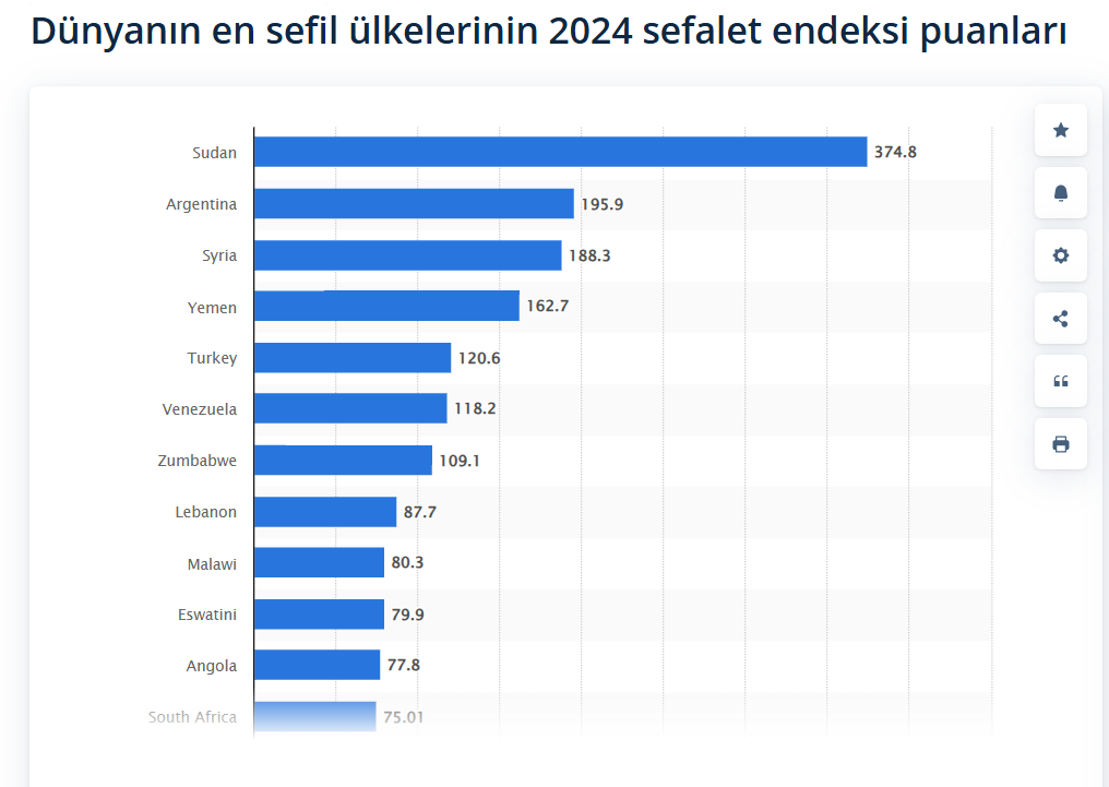 Sosyal medyada dolaşan iddiaların aksine, sefalet endeksinin güncel verilerine bakıldığında Türkiye’nin listede ilk sırada olmadığını görüyoruz. Uluslararası ekonomik göstergeler ve endeksin bileşenleri incelendiğinde, en yüksek puanı alan ülke Sudan olarak karşımıza çıkıyor.