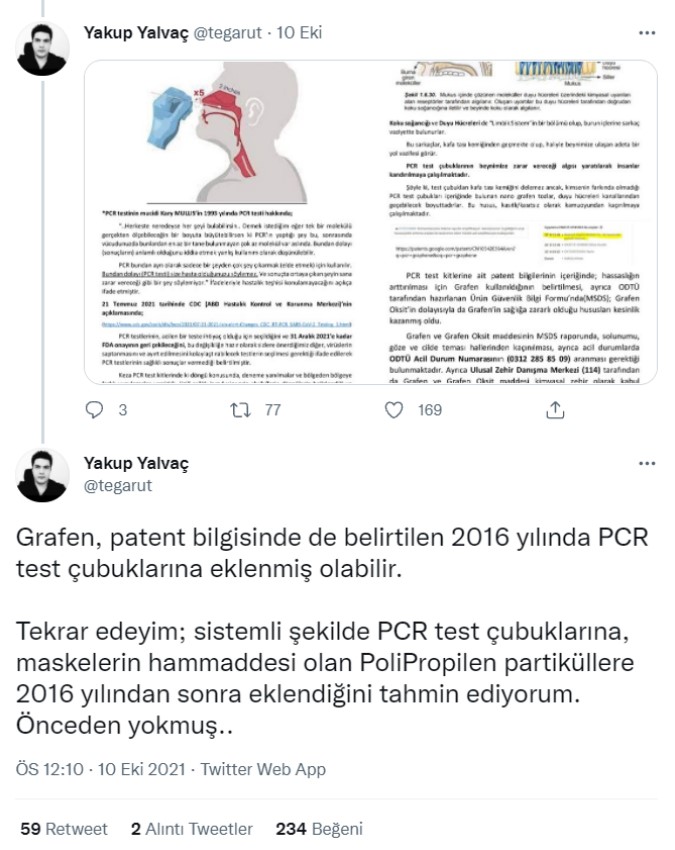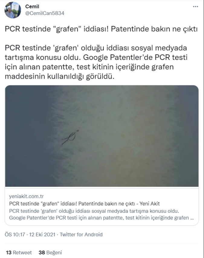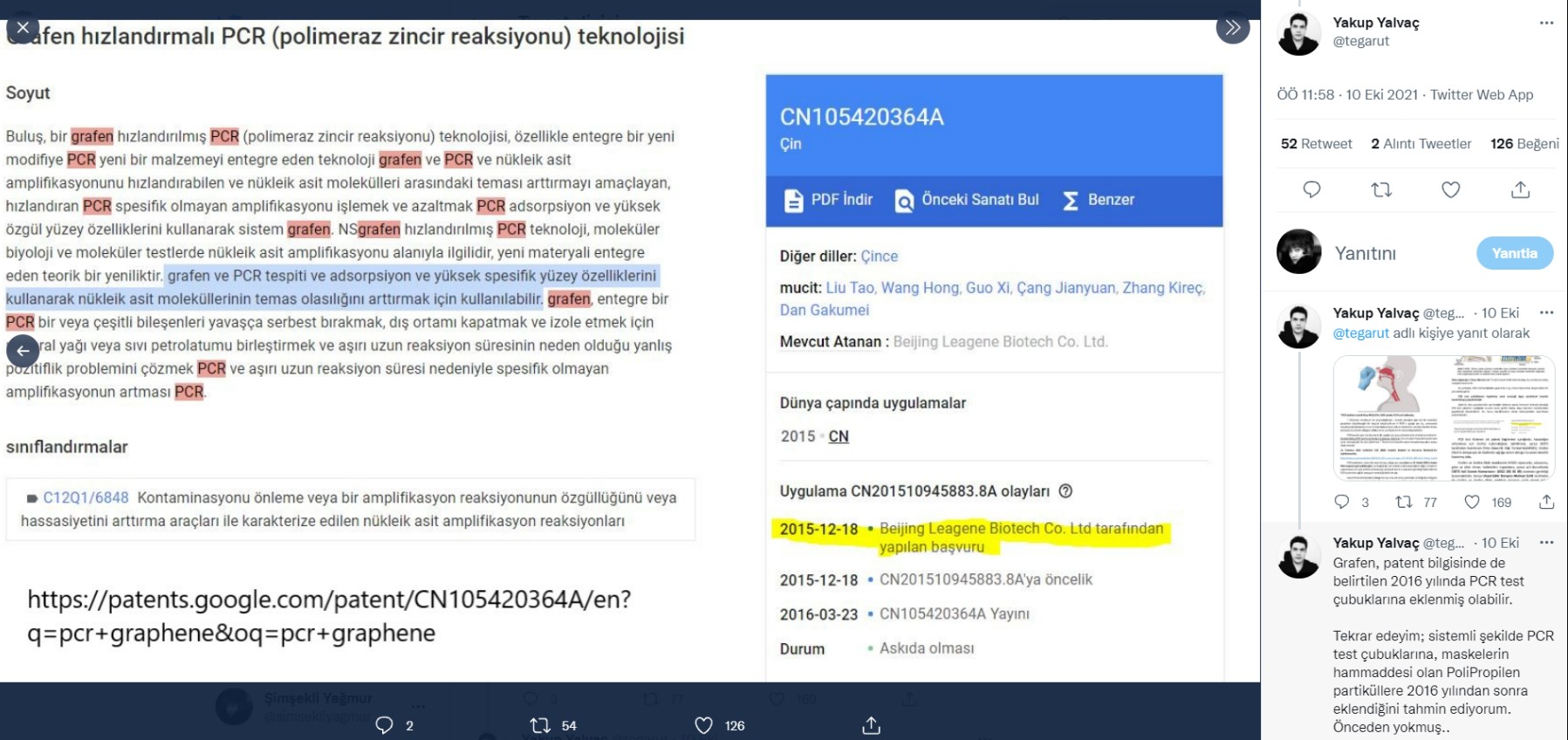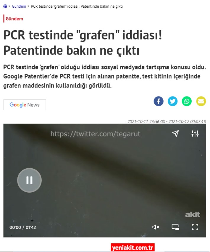 Ardından bazı sosyal medya kullanıcıları tarafından da bu haber kaynak gösterilip PCR testi için alınan patentte test kitinin içinde grafen maddesinin kullanıldığı iddia edildi.