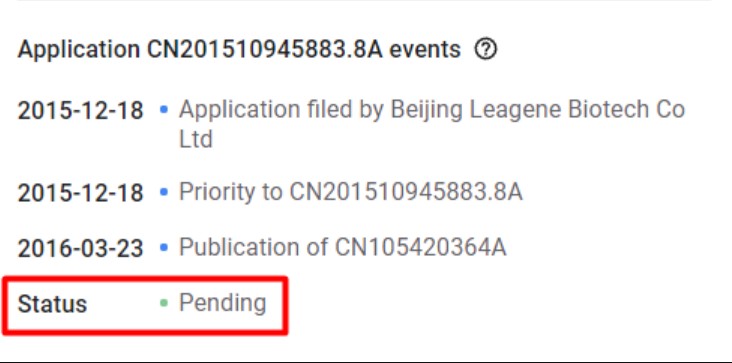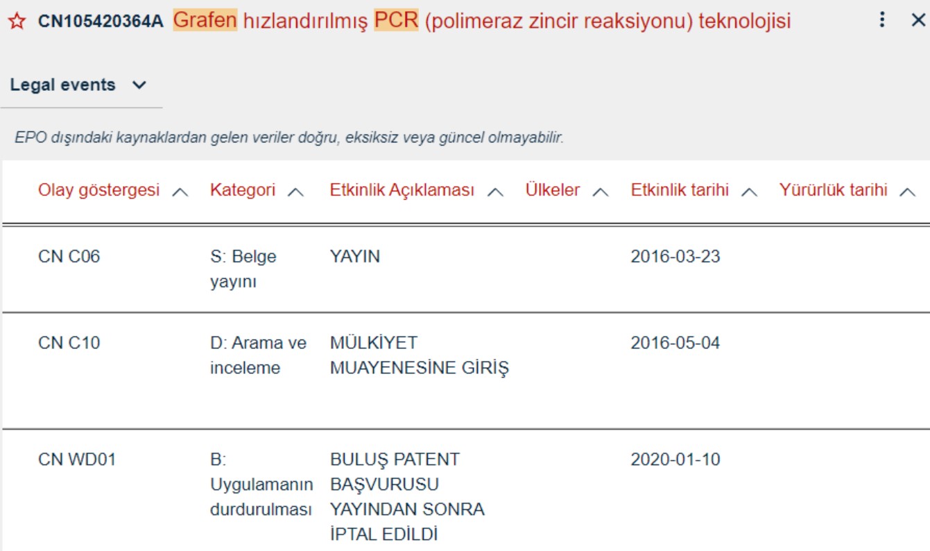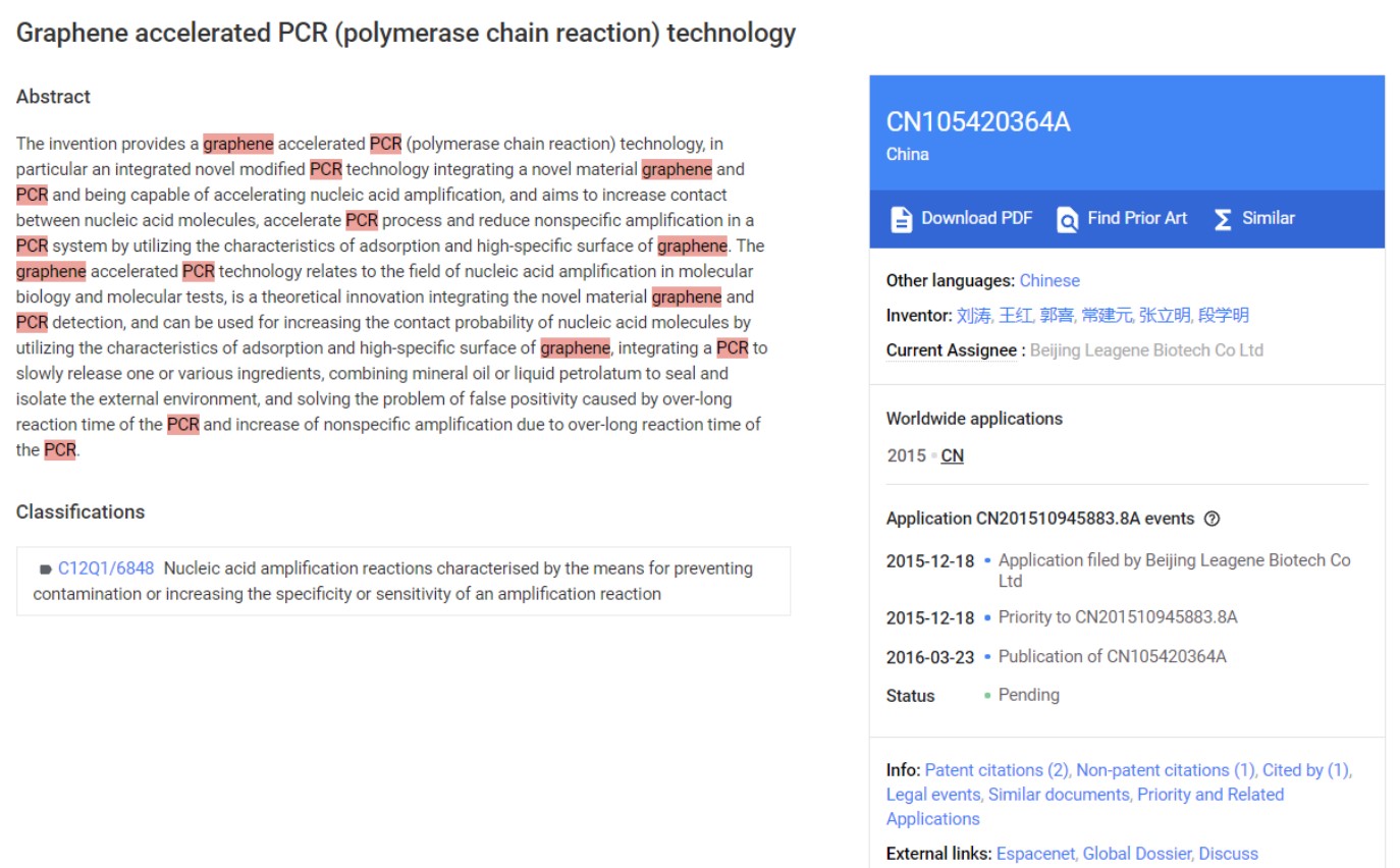 ‘Grafenle hızlandırılmış PCR (polimeraz zincir reaksiyonu) teknolojisi’ başlığı ile 18.12.2015 tarihinde Beijing Leagene Biotech Co Ltd tarafından bu buluşun patent başvurusu gerçekleşmiş. 23.03.2016 tarihinde bu belge yayımlanmış. Ancak belgenin şu andaki durumunda ‘pending’ yani ‘askıda’ yazdığını görmek mümkün.