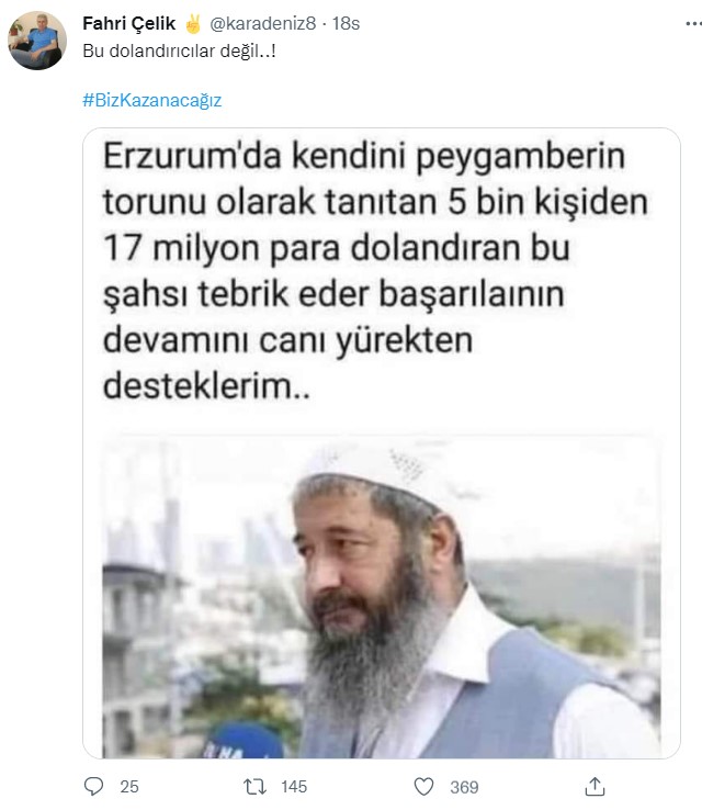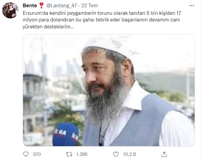 Twitter’da paylaşılan bir görüntü, kullanıcılar arasında kısa sürede gündem oldu. Görseldeki kişinin kendisini ‘peygamber torunu’ olarak tanıtarak 5 bin kişiden 17 milyon para toplandığı ve insanları dolandırdığı iddia edilmiş.