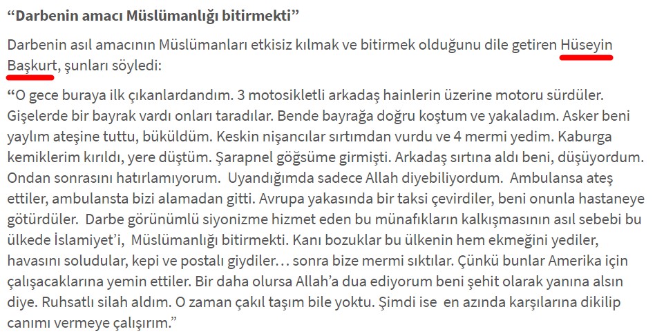 O gece buraya ilk çıkanlardandım. 3 motosikletli arkadaş hainlerin üzerine motoru sürdüler. Gişelerde bir bayrak vardı onları taradılar. Bende bayrağa doğru koştum ve yakaladım. Asker beni yaylım ateşine tuttu, büküldüm. Keskin nişancılar sırtımdan vurdu ve 4 mermi yedim. Kaburga kemiklerim kırıldı, yere düştüm. Şarapnel göğsüme girmişti. Arkadaş sırtına aldı beni, düşüyordum. Ondan sonrasını hatırlamıyorum. Uyandığımda sadece Allah diyebiliyordum. Ambulansa ateş ettiler, ambulansta bizi alamadan gitti. Avrupa yakasında bir taksi çevirdiler, beni onunla hastaneye götürdüler. Darbe görünümlü siyonizme hizmet eden bu münafıkların kalkışmasının asıl sebebi bu ülkede İslamiyet’i, Müslümanlığı bitirmekti. Kanı bozuklar bu ülkenin hem ekmeğini yediler, havasını soludular, kepi ve postalı giydiler… sonra bize mermi sıktılar. Çünkü bunlar Amerika için çalışacaklarına yemin ettiler. Bir daha olursa Allah’a dua ediyorum beni şehit olarak yanına alsın diye. Ruhsatlı silah aldım. O zaman çakıl taşım bile yoktu. Şimdi ise en azında karşılarına dikilip canımı vermeye çalışırım.