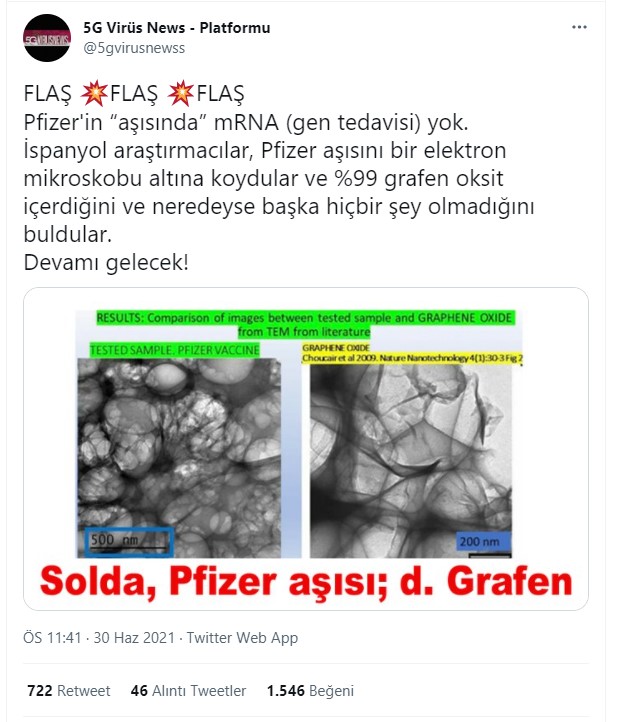 İlgili makale resmi ve güvenilir akademik kaynaklarda yer almamaktadır. Bunun yanında makalede öne sürülen argüman sadece elektron mikroskopu ile çekilen iki görselin birbirine benzemesidir. Sadece bu benzerliğe bakarak mRna aşısında grafen oksit bulunduğu sonucuna varılamaz. Ayrıca BioNTech aşısının içeriği de açıklanmıştır.
