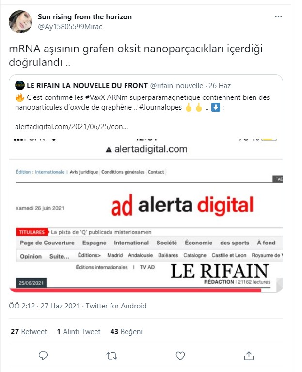 Twitter’da yayılımda olan iddialara göre Pfizer-BioNTech aşısının %99 oranında grafen oksit içermektedir. Dahası bu grafen oksit ile insan vücuduna etki edebileceği iddia edilmiştir.