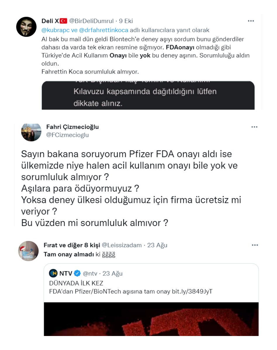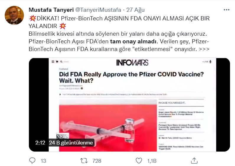 Pfizer COVID-19 aşısının FDA onayı almadığı iddiaları çığ gibi büyürken FDA’nın hiçbir aşıya onay vermediği gibi iddialar da. Ayrıca birçok sosyal medya platformunda olduğu gibi Tiktok’da da ABD Gıda ve İlaç İdaresi’nin Pfizer COVID-19 aşısına onay verdiği haberinin sahtekarlık olduğu öne sürülerek paylaşımlar yapıldı.