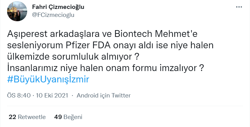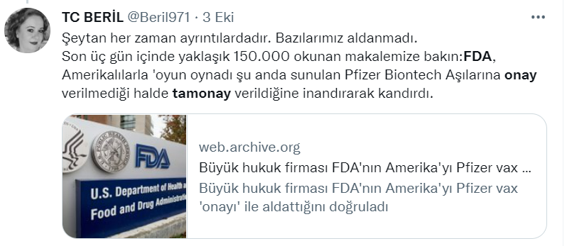 Sosyal medya kullanıcılarını ve haber mecralarını yanıltan detay şu; Pfizer COVID-19 aşısı yeni bir marka adı ile FDA onayı aldı. Yeni adı Comirnaty olan aşı FDA onaylı. George Washington Üniversitesi Milken Enstitüsü Halk Sağlığı Okulu’nda Yar.Doç. olan Emily Smith tarafından desteklenmekte. Reuters bir e-posta ile Smith’in, Comirnaty’nin Pfizer-BioNTech aşısıyla aynı olduğunu bilgisini kendilerini ilettiğini resmi sayfasında bildirdi.