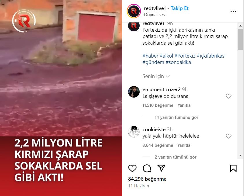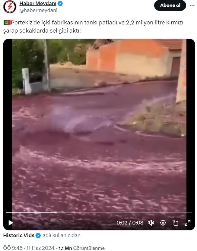 Haberin detaylarına bakıldığında Portekiz’in Anadia şehrine bağlı São Lourenço de Bairro kasabasında Levira şarap şirketine ait iki tankın devrilmesi sonucu 600 bin galon -yaklaşık 2.2 milyon litre- kırmızı şarabın yola aktığı aktarılmış.