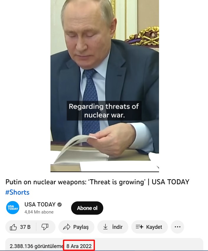 Son olarak videonun ilk karesini alıp tersine görsel arama metodu ile arıyor ve bazı bulgulara erişiyoruz. Aralık 2022’de yapılan konuşmada, Putin’in İsrail ve Filistin çatışmaları ile ilgili bir demeç vermediği anlaşılıyor. Videonun orijinal haline USA Today’in YouTube kanalından erişmek mümkün.