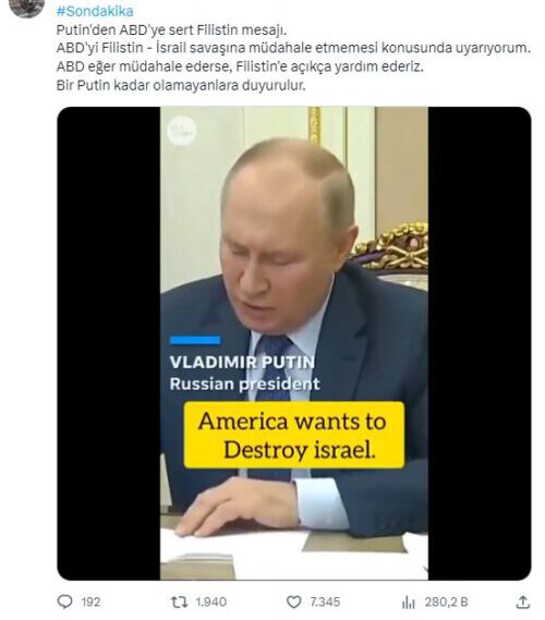 Öte yandan liderlerin konuyla ilgili yakın temaslarda bulununduklarını ve çeşitli açıklamalar yaptıklarını da görüyoruz. Geçtiğimiz gün Rusya lideri Vladimir Putin’in ABD’yi söz konusu olaylar konusunda uyardığı öne sürülen bir video yayılıma girdi. Bahse konu videoda Putin’in, şayet ABD’nin savaşa dahil olması durumunda Rusya’nın Filistin’e yardım edeceğini söylediği iddia edildi.