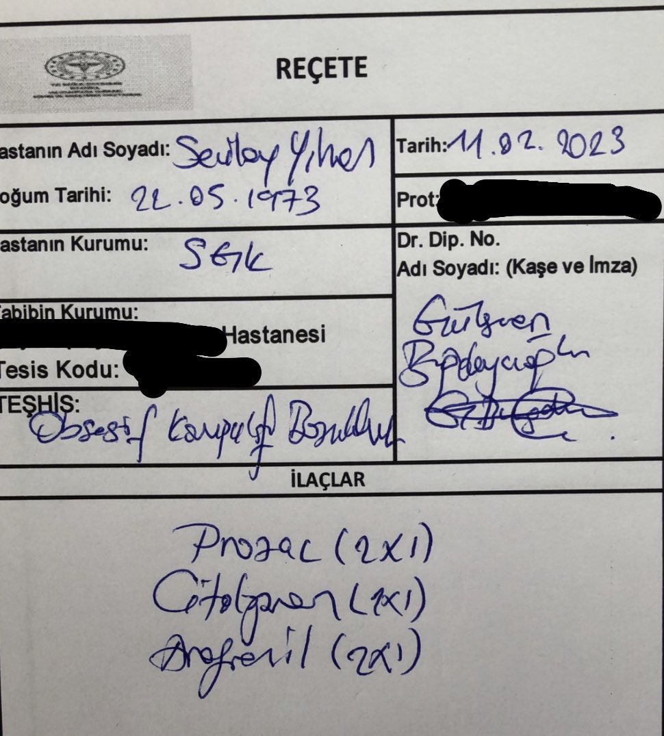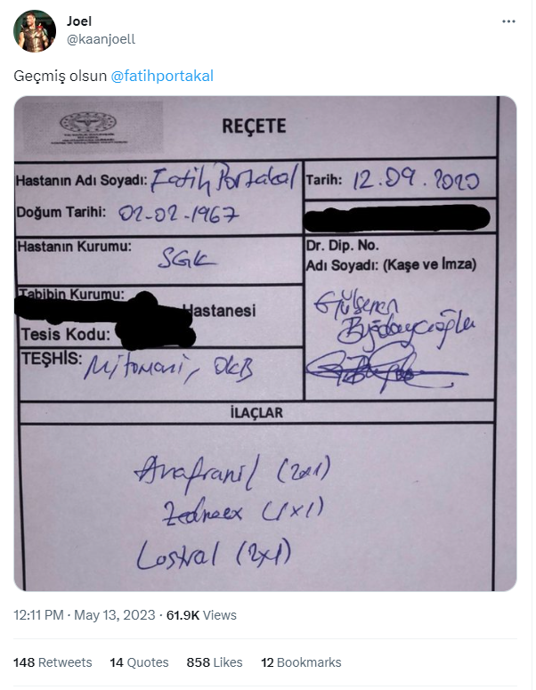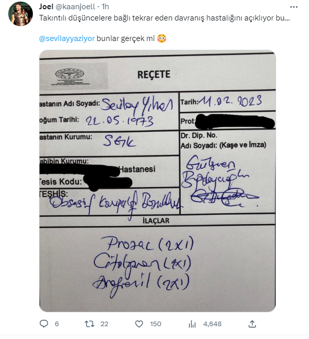 Gazetecilere yönelik iddialarına devam eden aynı twitter kullanıcısı bu defa Fatih Portakal ve Sevilay Yılman adına sözde reçete görüntüleri paylaştı. Reçetede konulan teşhise göre Fatih Portakal’ın mitomani (yalan söyleme hastalığı), Sevilay Yılman’ın da ‘Obsesif Kompulsif Bozukluk’ hastalığı olduğu iddia edildi.
