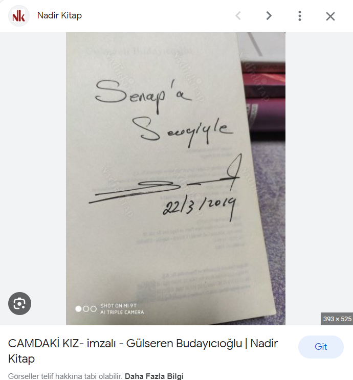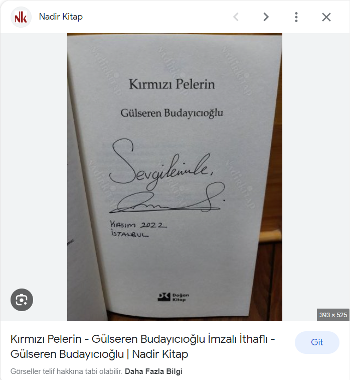 Gülseren Budayıcıoğlu’nun imzası, taklit edilmiş. Budayıcıoğlu’nun Camdaki Kız ve Kırmızı Pelerin adlı romanlarında okuyucular için atmış olduğu imzasıyla iddia görselindeki imza karşılaştırıldığında imzaların bariz bir şekilde uyuşmadığı fark ediliyor.