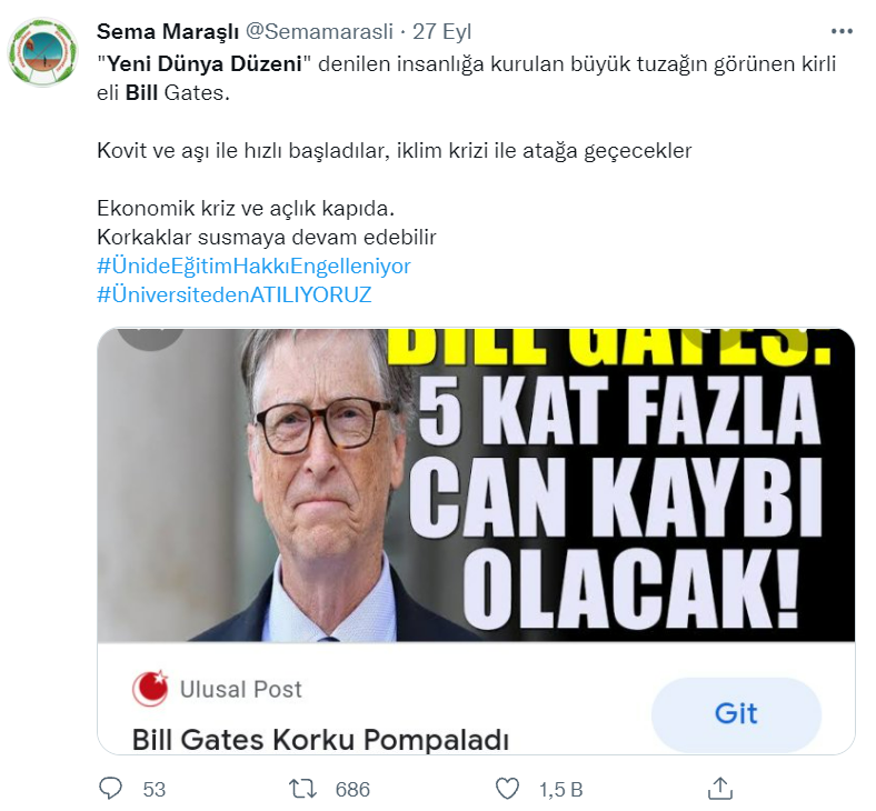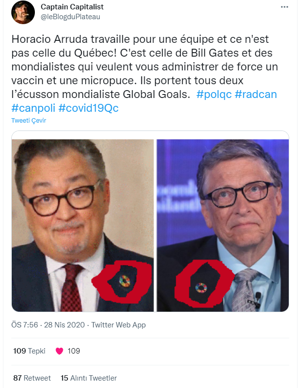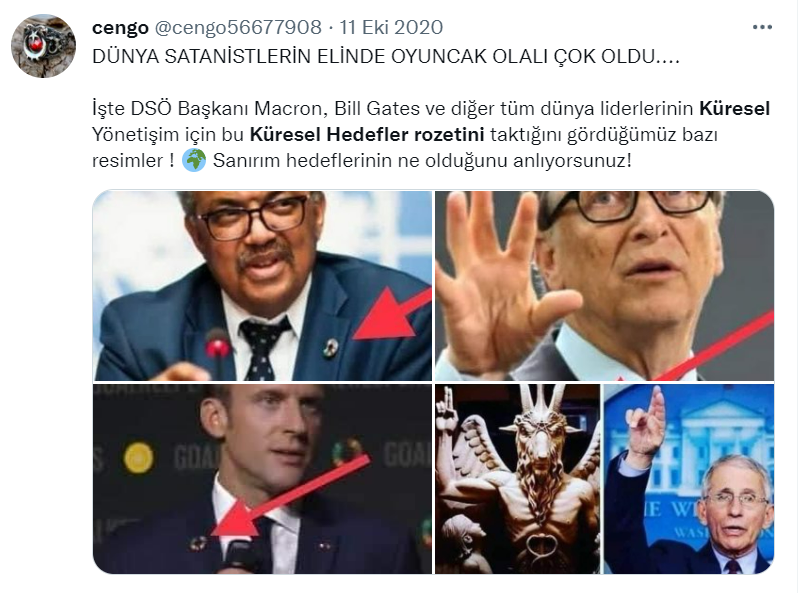 Sosyal medya platformlarında paylaşılarak binlerce görüntülenme sayısına ulaşan iddiada Dünya Sağlık Örgütü genel müdürü ve Microsoft’un kurucularından Bill Gates ile birlikte; Fransa Cumhurbaşkanı Emmanuel Macron’un, Kanada’nın Quebec eyaletinde Ulusal Halk Sağlığı Direktörü Horacio Arruda‘nın, Dünya Sağlık Örgütü Genel Direktörü Tedros Adhanom Ghebreyesus‘un da rozetli fotoğrafları yer alıyor.