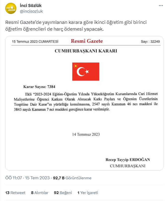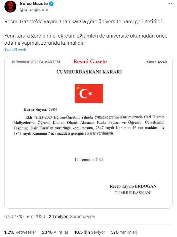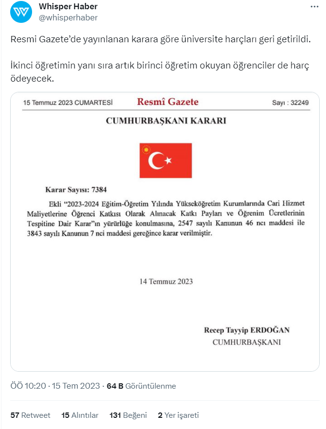 Sosyal medyada 15 Temmuz 2023 tarihli Resmi Gazete’de yayımlanan Cumhurbaşkanı Kararı’na ilişkin bazı iddialar ortaya atıldı. İddialar üniversite öğrencilerinin harçları ile ilgiliydi. Çıkartılan karar ile üniversite harcı olarak bilinen öğrenci katkı payı veya öğrenim ücretlerinin geri getirildiği ve birinci öğretimdeki öğrenciler tarafından da ödeneceği iddia edildi.
