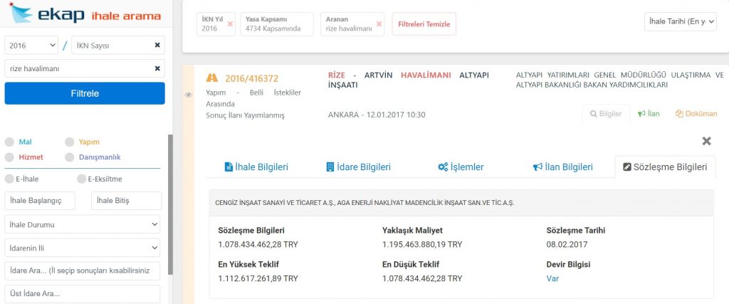 3 Nisan 2017’de temeli atılan Rize-Artvin Havalimanının, açık usulle yapılan ihalesinde en düşük teklif 1 milyar 78 milyon 434 bin 462 TL karşılığında, Cengiz İnşaat ile Aga Enerji ortaklığına verildi. 8 Kasım 2019’da yapılan ikmal ihalesiyle birlikte 369 milyon 800 bin TL karşılığında eski AKP Rize Milletvekili Abdulkadir Kart’ın Asl İnşaat Şirketi’ne verildi. Havalimanı, geçtiğimiz günlerde işletmeye açılmıştı.