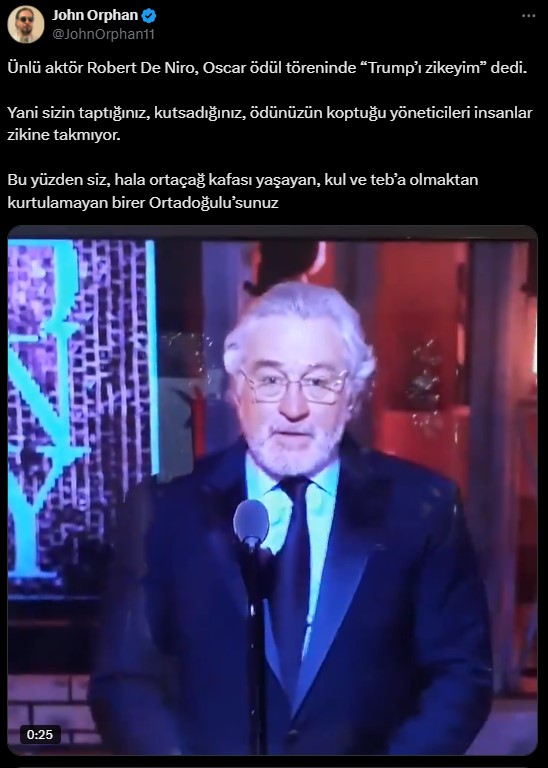 Bahse konu video izlendiğinde, Robert De Niro’nun sahneye çıktığını ve şu ifadeleri kullandığını görüyoruz: