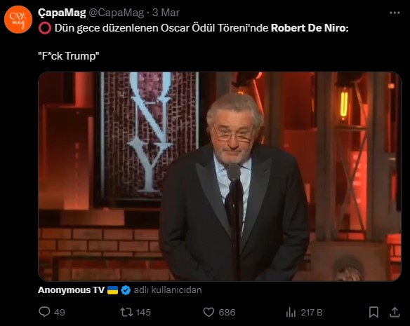 Ünlü Hollywood aktörü Robert De Niro’nun sahneye çıkarak, mevcut ABD başkanı Donald Trump’a küfrettiği ve bu sözlerin seyirciler tarafından alkışlandığı anlar ise Oscar töreni ile ilişkilendirildi.