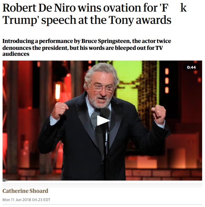 Guardian News’in YouTube kanalındaki görüntüde, “TONY awards” yazısının tamamı görülebilir. Haziran 2018 tarihli haberin detayları okunduğunda mikrofonu eline alan De Niro’nun, Tony Özel Ödülü’nü kazanan Bruce Sprinsteen’i sahneye davet etmeden önce söz konusu cümleleri sıraladığı görülüyor. Dolayısıyla iddia edildiği gibi bu ifadelerin Oscar ödüllerinde dile getirildiği görüşünün yanlış olduğu sonucuna ulaşıyoruz.