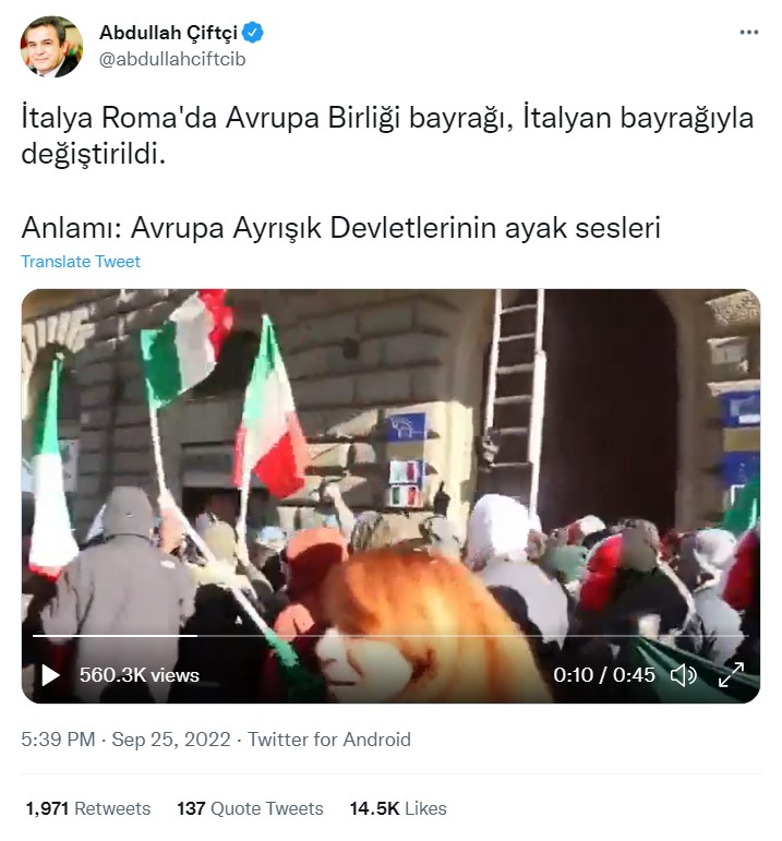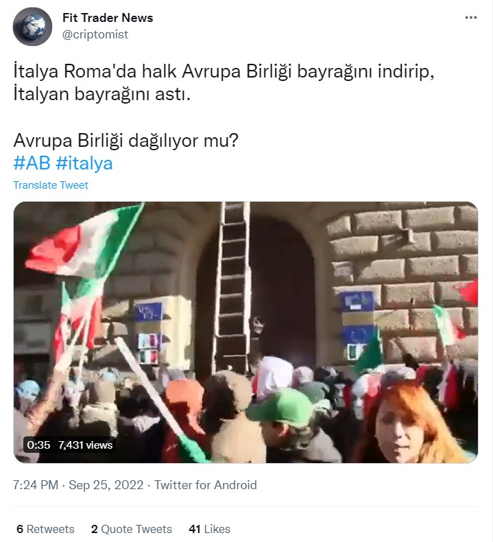 Bu paylaşımlardan biri, protestocuların kapısında Avrupa Birliği sembolü olan bir binadaki Avrupa Birliği bayrağının İtalya bayrağıyla değiştirildiğini gösteren videoyu içeriyor.