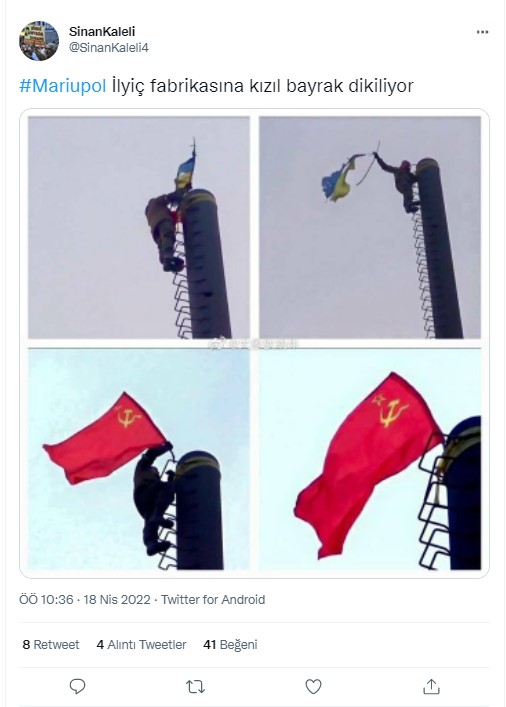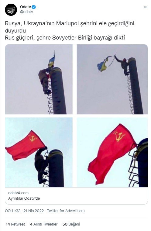 Sosyal medyada yayılan bir iddiada Rus güçleri ele geçirdiği Mariupol şehrine Sovyetler Birliği Bayrağı dikti. İddia bir fotoğrafla paylaşıldı. Fotoğrafta bir askerin Ukrayna bayrağının indirilip Sovyetler Birliği Bayrağı dikildi. Fotoğrafın İlyiç fabrikasından olduğu söyleniyor. Oda TV’de bu paylaşımı haberleştirdi.