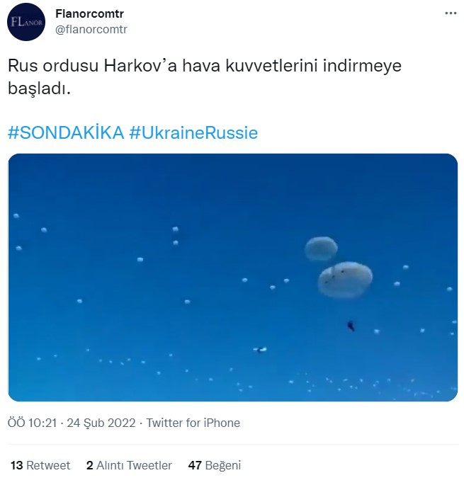 İddiaya inanan ve paylaşan bir diğer sosyal medya kullanıcısı ise videoyu paylaşarak: ” Rus ordusu Harkov’a hava kuvvetlerini indirmeye başladı” yorumunu yapmış.