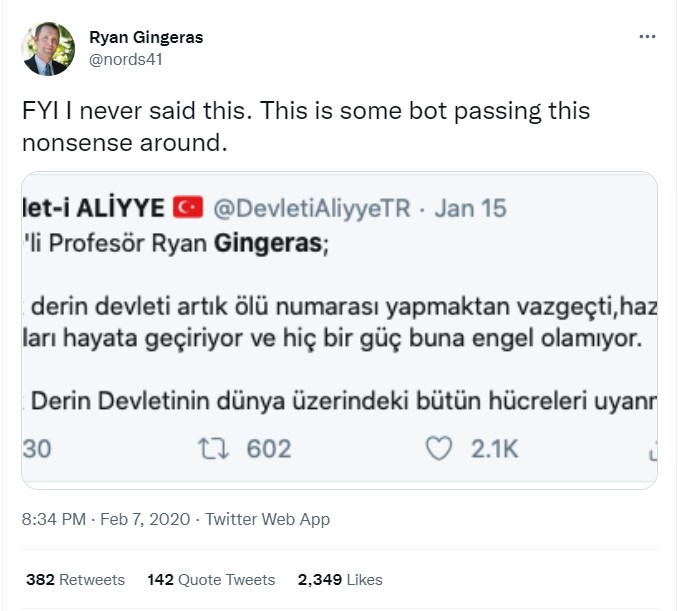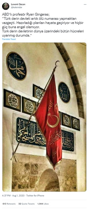 Ryan Gingeras ve Türkiye’deki derin devlet hakkında ortaya atılan bir diğer iddia ise 2020 yılında karşımıza çıkıyor. İddiaya göre Gingeras, ‘Türk derin devleti artık ölü numarası yapmaktan vazgeçti, hazırladığı planları hayata geçiriyor ve hiçbir güç buna engel olamıyor. Türk Derin Devletinin dünya üzerindeki bütün hücreleri uyanmış durumda.’ diyor.