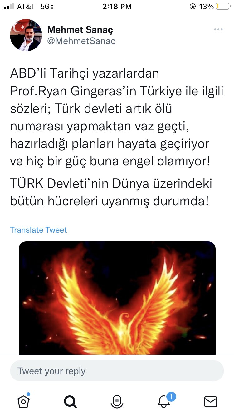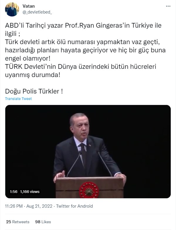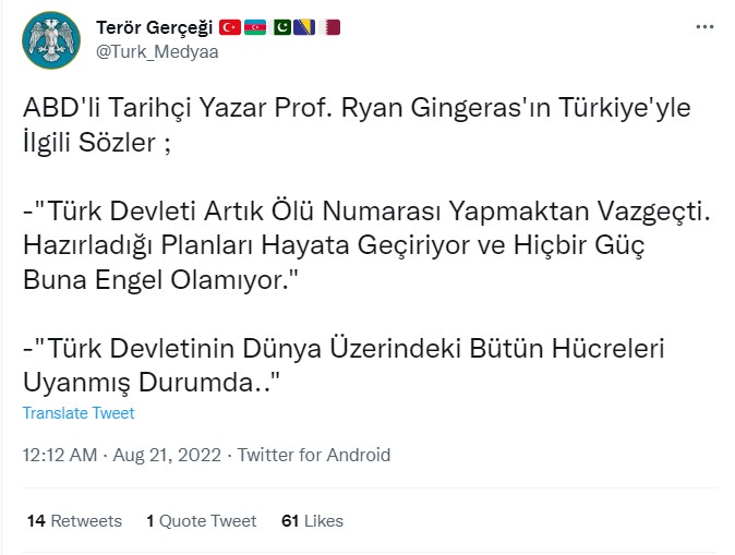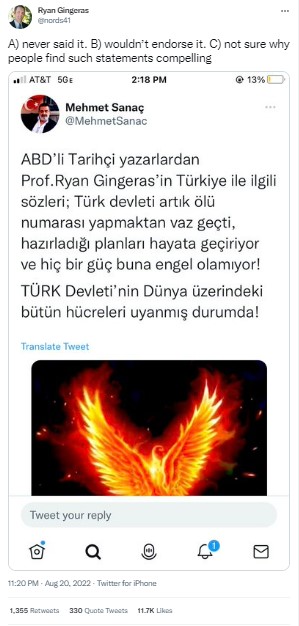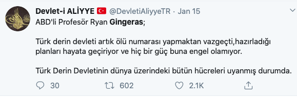2020’de ortaya atılan ‘Türk derin devleti artık ölü numarası yapmaktan vazgeçti’ iddiasını kendi hesabından paylaşan Ryan Gingeras, paylaşımına şu notu düşmüş: