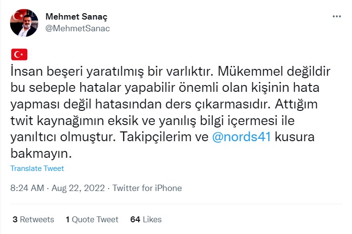 - Ağustos 2022’de iddianın yeniden yayılmasına neden olan sosyal medya hesabından ifadenin doğru olmadığına dair açıklama ve özür paylaşımı yapılmış.