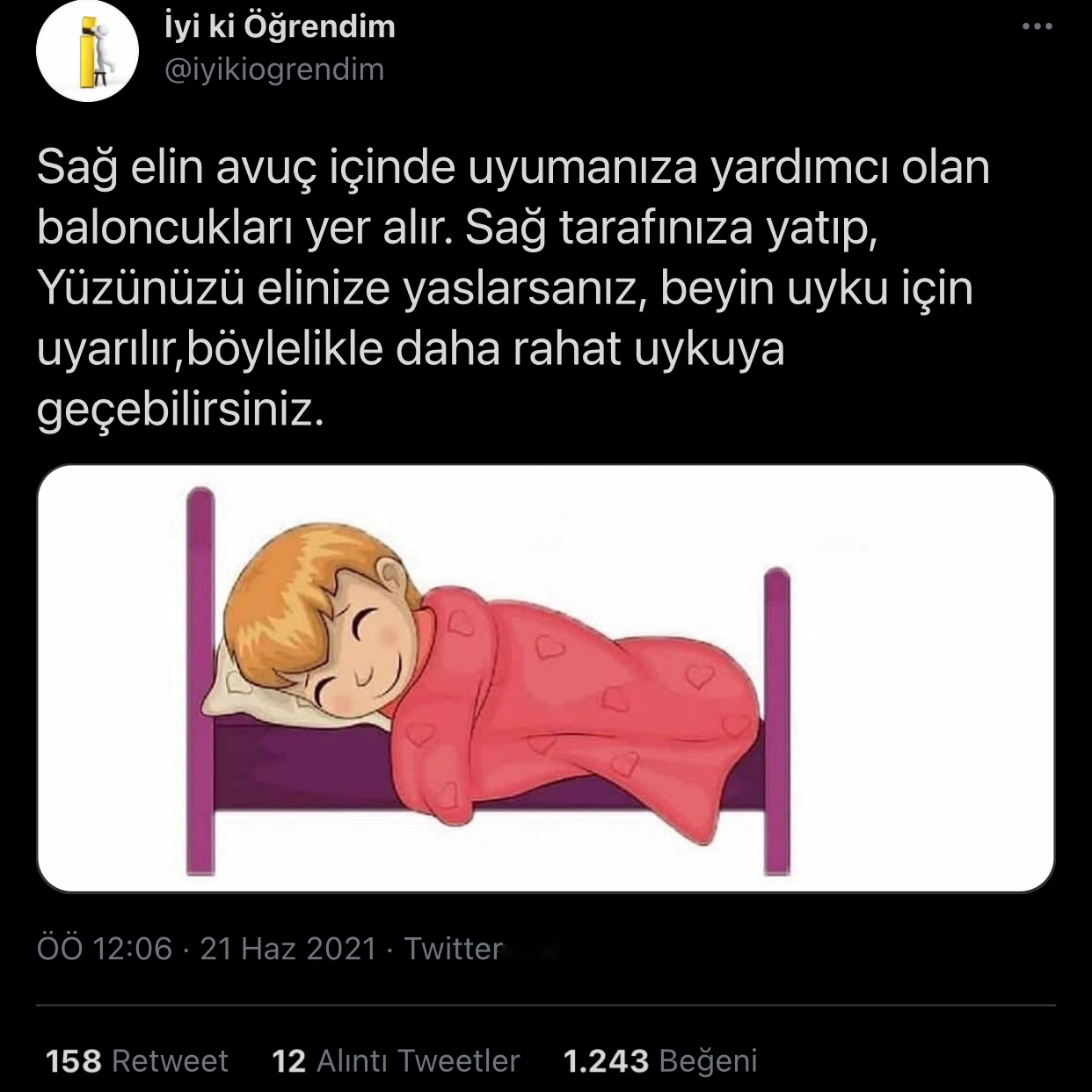Twiter’da @iyikiogrendim adlı sayfanın 21.06.2021 tarihli paylaşımında, sağ elin avuç içinde uyumaya yardımcı olan baloncukların olduğu iddia edildi. İddiaya göre sağ tarafınıza yatıp, yüzünüzü elinize yaslarsanız, beyin uyku için uyarılıyor ve böylelikle daha rahat uykuya geçilebiliyor. Merak uyandıran bu iddia sosyal medya kullanıcıları tarafından yoğun ilgi görerek yüksek oranda etkileşim aldı. Daha önceki yıllarda da birçok haber mecrası tarafından paylaşıldığı konusunda eleştirilen iddiaya inanmayanlar olduğu gibi mümkün olma ihtimali üzerinde de duranlar var. Peki gerçekten sağ elimizde uyku baloncukları var mı?