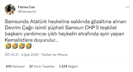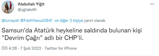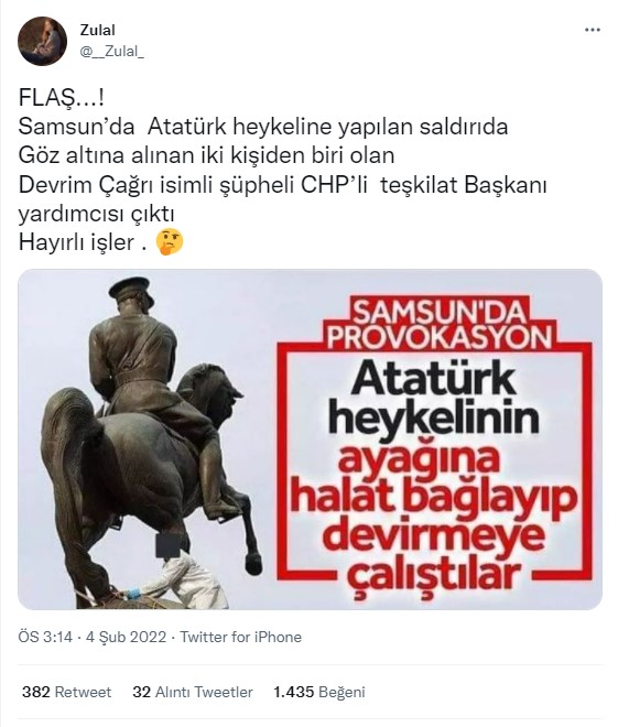 Sosyal medya anıta saldıran kişi ile ilgili ortaya bir iddia atıldı. Bu iddiaya göre saldırıyı gerçekleştiren kişi Samsun CHP İl teşkilat başkanı yardımcısı Devrim Çağrı’dır. İddiayı pek çok kullanıcı paylaştı. İddianın paylaşımı güncel olarak da devam ediyor.