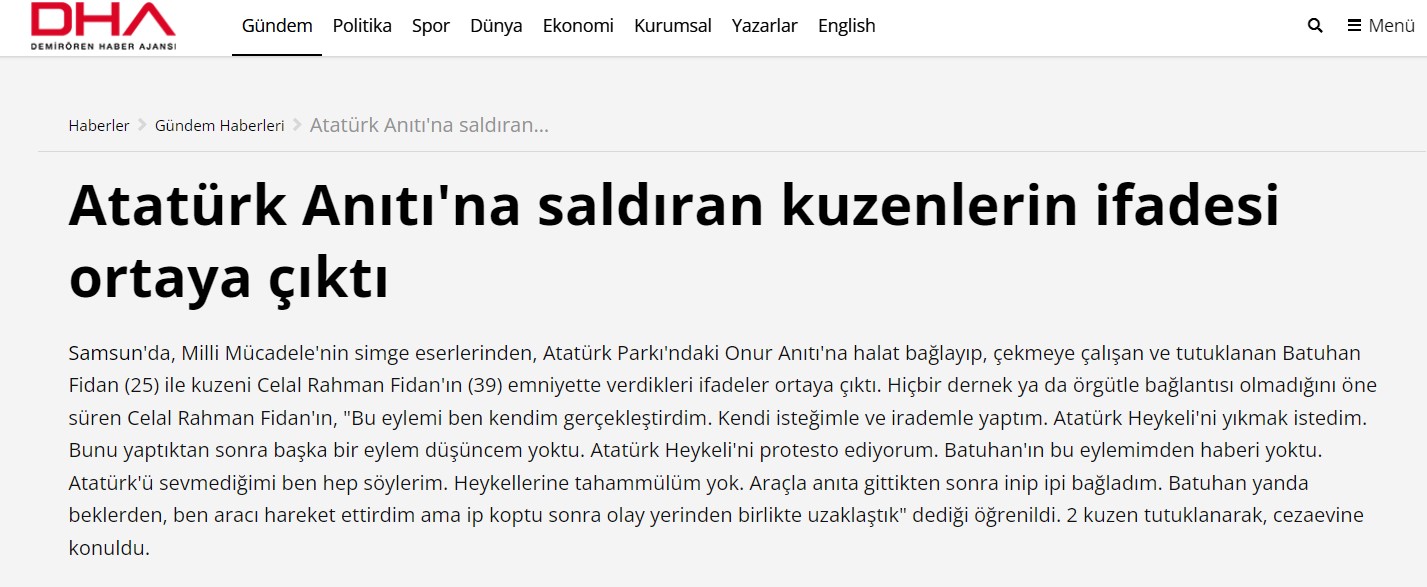 Samsun’da Onur Anıtı’na saldırıyı gerçekleştirenin ne Devrim Çağrı olduğuna ne de Samsun İl Teşkilatı’na üye olduğuna dair herhangi bir kanıt yok. Ayrıca, bazı haber ajanslarına göre yakalanan saldırganlar B.F. ve C.F.’dir.