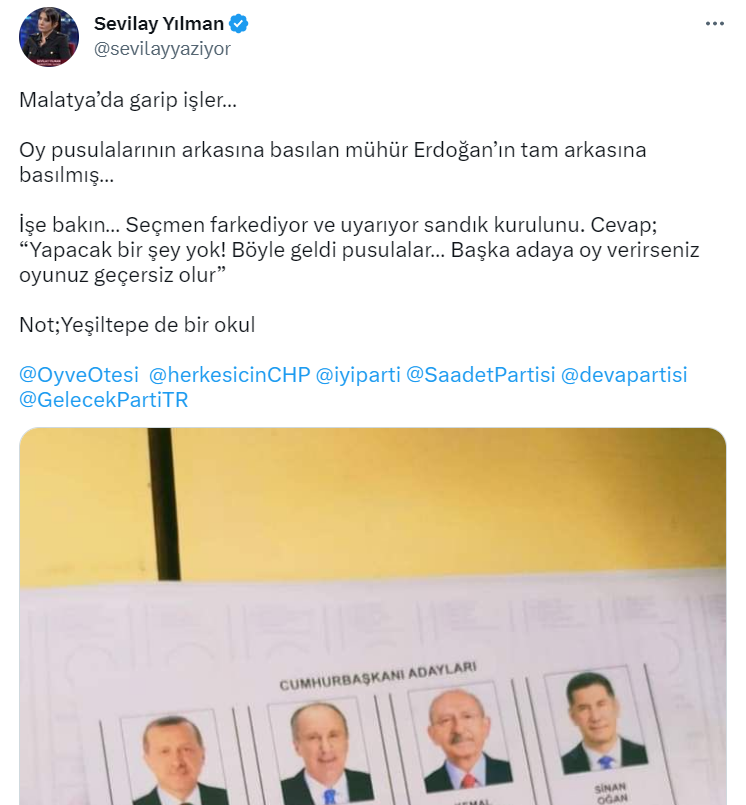 Twitter’da bazı kullanıcılar sandık kurulu mühür izinin pusulaların ön tarafına geçtiğini gösteren oy pusulalarını paylaşarak oyların geçersiz olup olmadığını tartıştı.