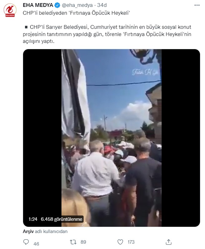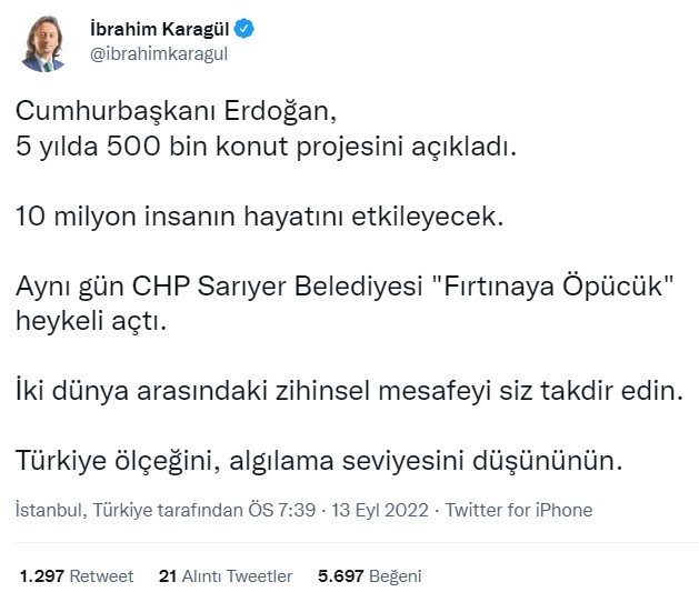13 Eylül 2022’de Cumhurbaşkanı Recep Tayyip Erdoğan, sosyal konut projesi tanıtım toplantısında 5 yılda 500 bin sosyal konut yapılacağının bilgisini vermişti. Aynı gün bazı Twitter kullanıcıları, Sarıyer Belediyesi’nin “Fırtınaya Öpücük” adlı heykelin açılışını yaptığını belirtti.