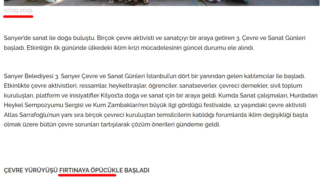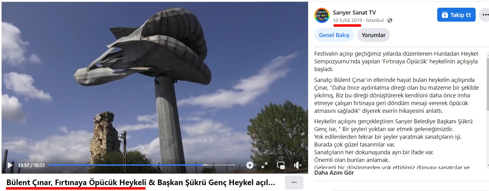 Google’da “Sarıyer Belediyesi” ve “Fırtınaya Öpücük Heykeli” ifadeleri ile konuyu aradığımızda, Bülent Çınar tarafından tasarlanan bu döner heykelin, geri dönüşüm maddelerini sanata dönüştürmek amaçlı yapıldığına dair bir bültene ulaştık. Sarıyer Belediyesi’nin 7 Eylül 2019’da yayımladığı ilgili bültende, Çınar’ın heykel açılış konuşması şu ifadelerle aktarılmış: