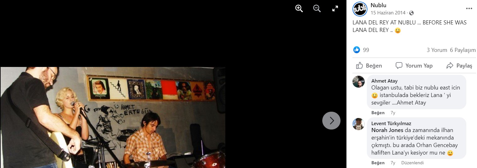 Bu sözün çevirisi ise, “Lana Del Rey Lana Del Rey olmadan önce Nublu’da” anlamına geliyor. Aktif olarak paylaşım yapılan Nublu Club’ın Facebook sayfasında, konser takvimleri, sanatçı fotoğrafları ve çeşitli bilgilendirmelerin yer aldığı anlaşılıyor.