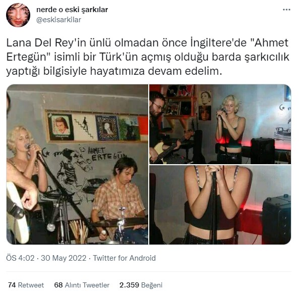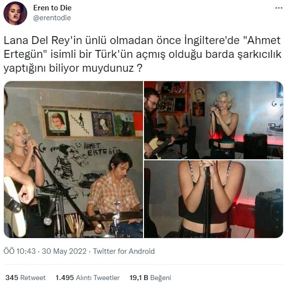 Geçtiğimiz günlerde sosyal medyada Amerikalı şarkıcı ve söz yazarı Elizabeth Woolridge Grant’ın yani herkesin tanıdığı isimle, ‘Lana Del Rey’in’ İngiltere’de ünlü olmadan önce müzik yapımcısı Ahmet Ertegün’ün barında şarkıcılık yaptığı iddia edildi. Şarkıcının hayranları aracılığıyla kısa sürede yayılan söylemin, sosyal medya kullanıcıları arasında gerçek olduğu düşünüldü. Ardından sanatçının fanları da kendi profillerinde iddia söylemini yorumlarını katarak paylaştı.