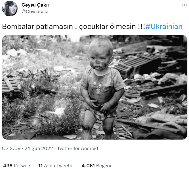 Twitter üzerinden yayılım gösteren bir fotoğrafta Ukrayna’da çatışmalar arasında kalmış çaresiz bir çocuğun olduğu belirtilmiş. Sosyal medya kullanıcıları arasında bu fotoğraftaki çocuk ile ilgili ‘çatışmadan çıkmış annesini aramaya çalışan bir çocuk’ olduğunu yönünde bir algı oluşmuş.