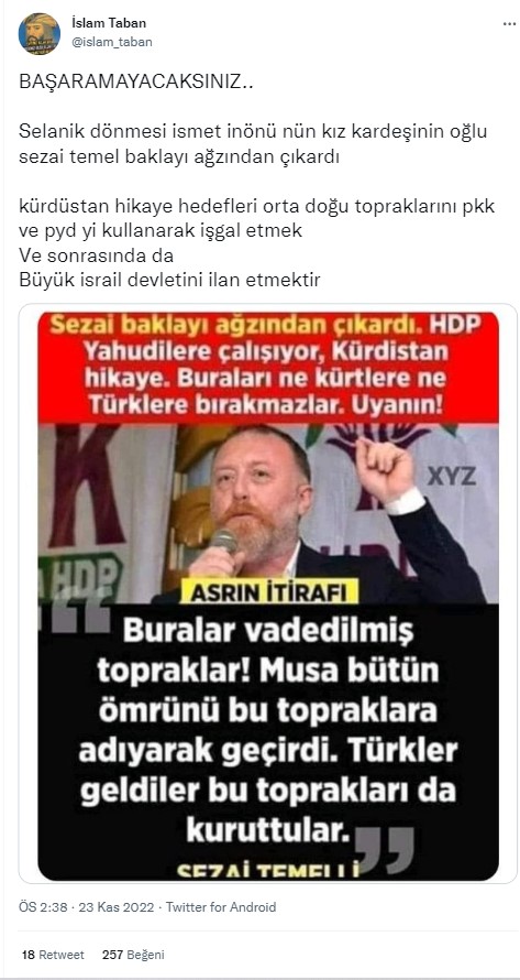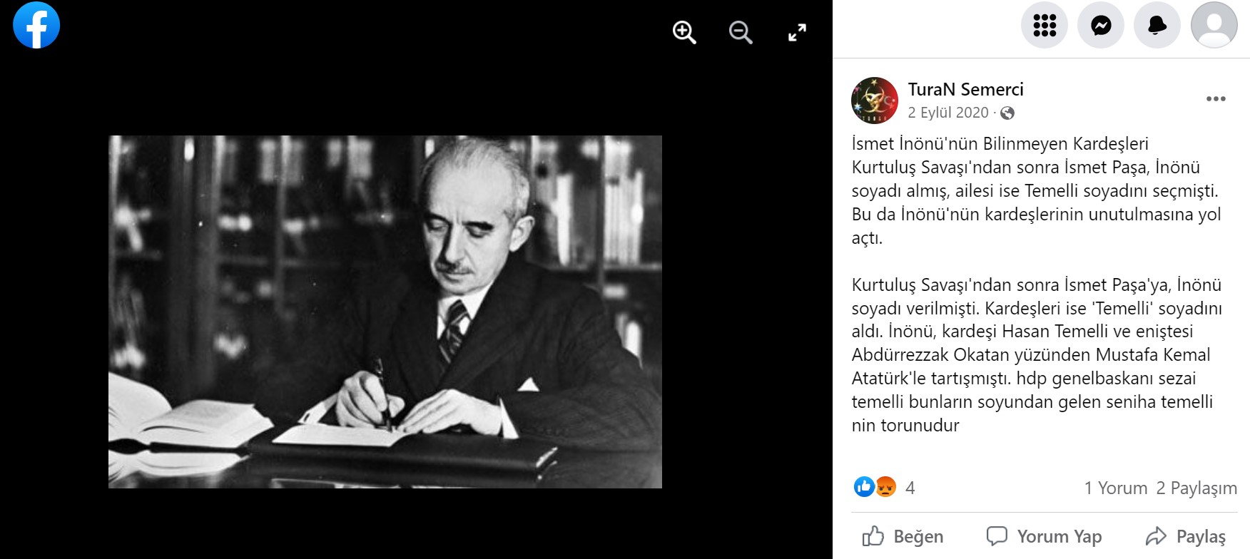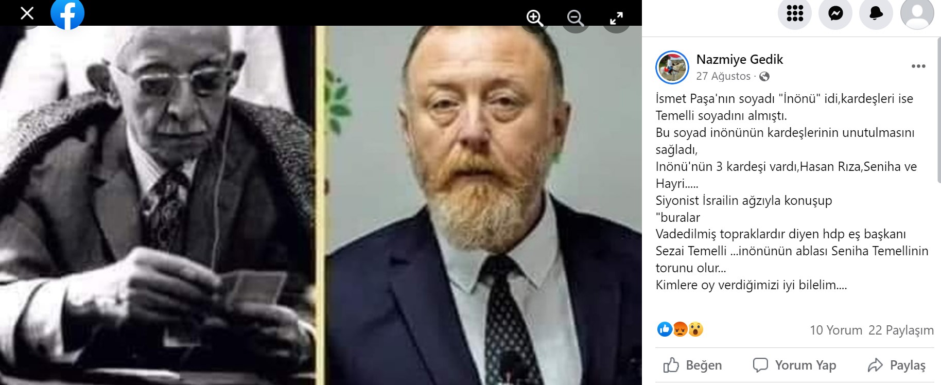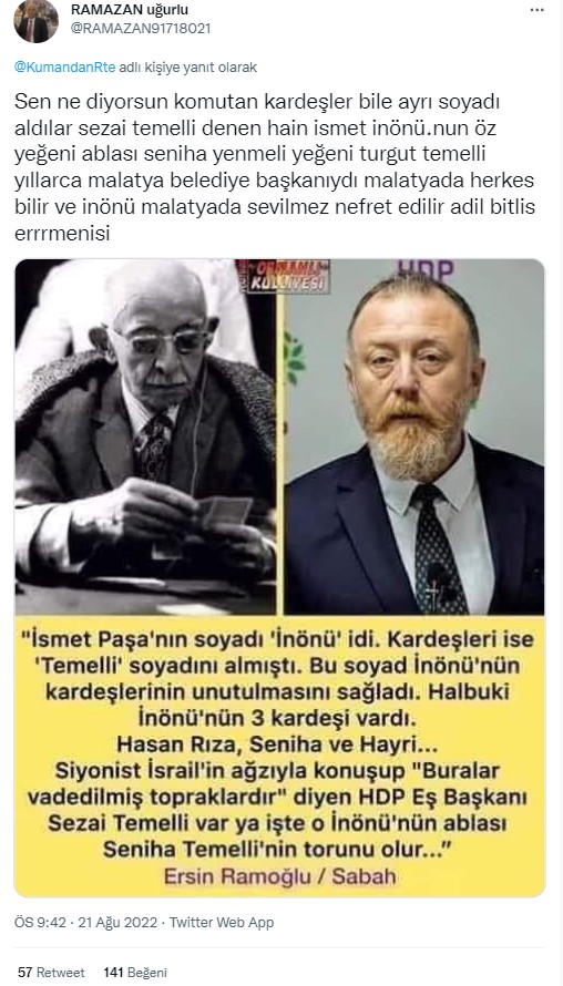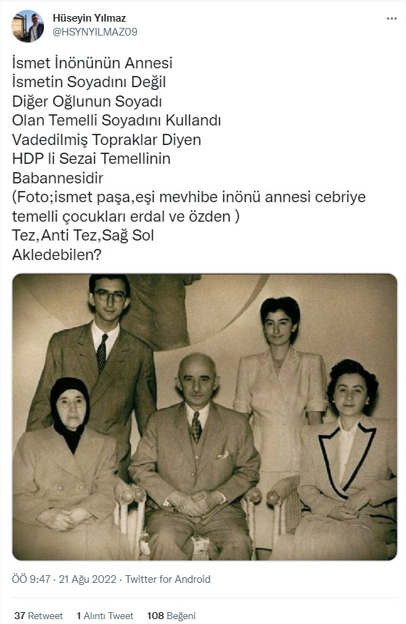 Sosyal medyada paylaşılan bir iddiaya göre İsmet İnönü ile HDP eski Eş Genel Başkanı Sezai Temelli akrabaymış.
