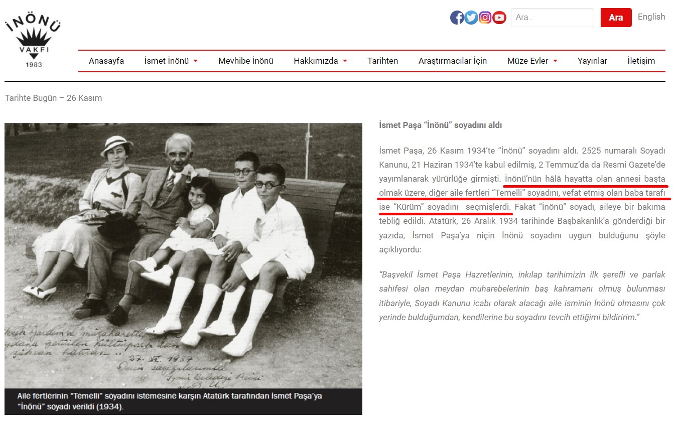 Atatürk İsmet İnönü’ye 1934 yılında “İnönü” soyadını verdi. Diğer aile fertleri ise “Temelli” soyadını aldı.