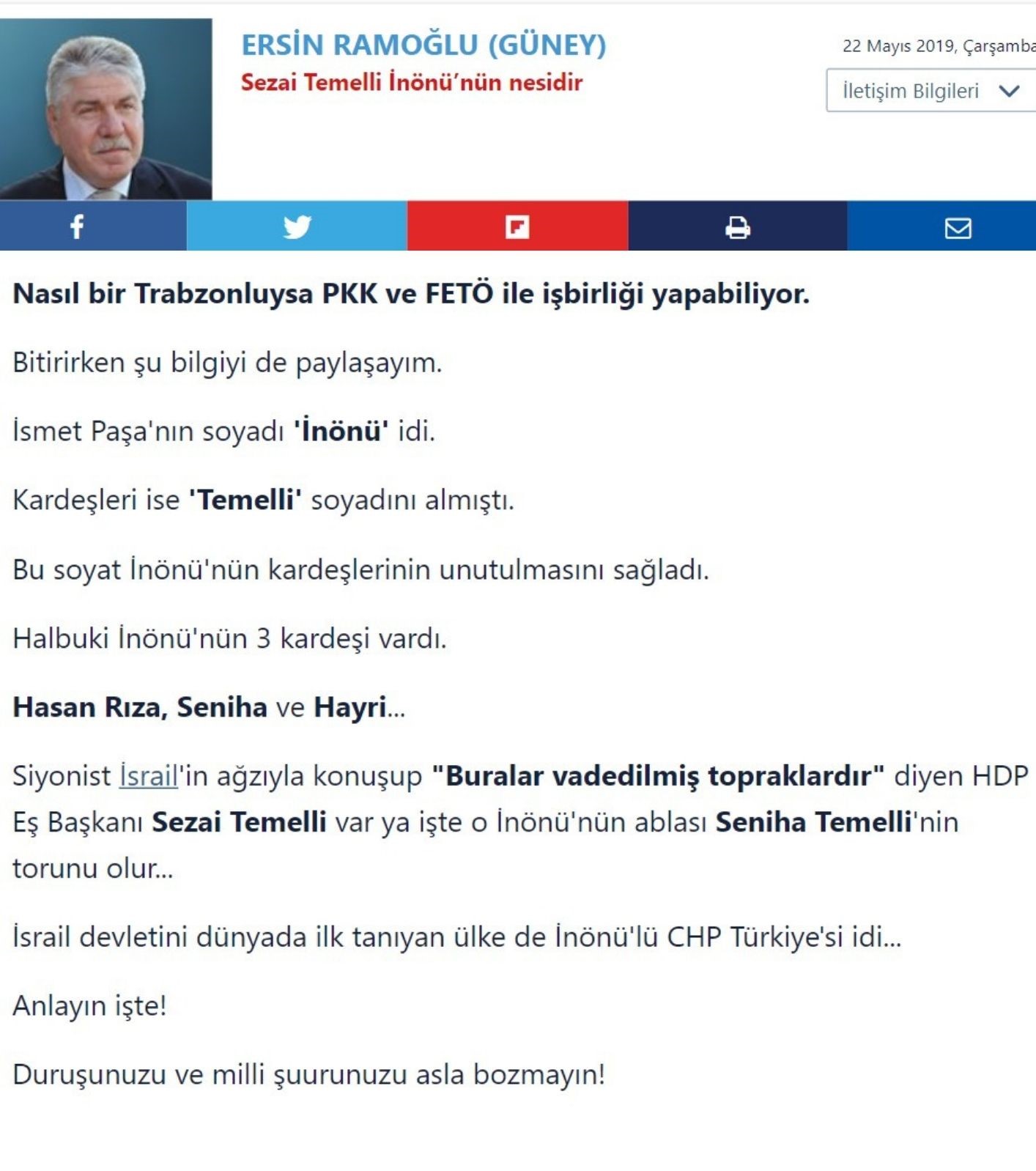 İddianın yayılımını araştırırken birçok paylaşımının kendisine kaynak olarak Sabah gazetesi yazarı Ersin Ramoğlu’nun 2019 yılındaki “Sezai Temelli İnönü’nün Nesidir?” yazısını aldığını gördük.