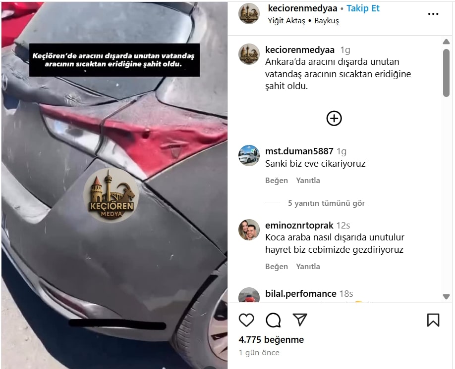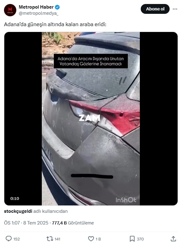 Sosyal medyada paylaşılan bir video hem Adana hem de Ankara’da çekildiği iddialarıyla paylaşılıyor. Videoda güneşin sıcaklığı nedeniyle eriyen bir araç olduğu iddia ediliyor.