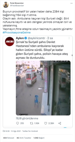 Bazı haber siteleri de ambulansı kaçıran kişinin Suriyeli olduğunu iddia etti