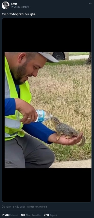 Ülke gündemi, birbiri ardına gelen yangın haberleriyle meşgulken, Twitter’da üstünde işçi yeleği olan bir adamın, kendisine yaklaşan sincaba su içirdiği bir fotoğraf, kullanıcılar arasında kısa sürede yayıldı. Görsel, “yılın fotoğrafı” başlığıyla sosyal medyada yer aldı ve 25 binden fazla etkileşim aldı.