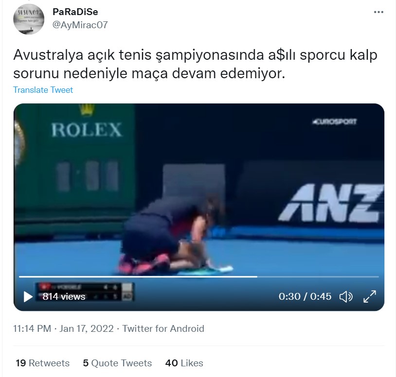 17-30 Ocak 2022’de Avustralya’da düzenlenen açık tenis turnuvasında yaşandığı iddia edilen bir olayı gösteriyor. Sosyal medya platformlarında paylaşılan bir görüntüde, tenisçi Dalila Jakupovic, Covid-19 aşısının yan etkilerinden kaynaklı bir sağlık sorunu yaşadığı iddia edildi.
