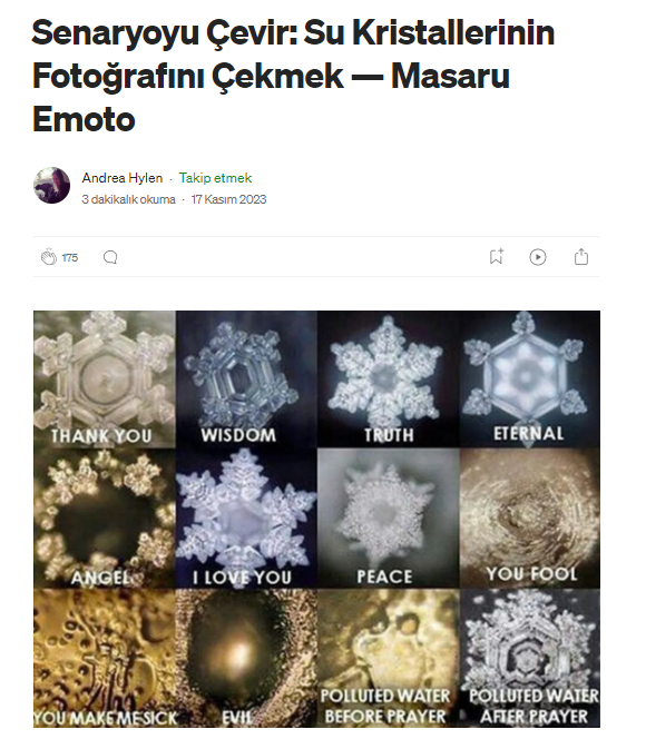 Araştırmayı sürdürürken aynı konuyu 2012 yılında inceleyen Evrim Ağacı’nı görüyoruz, benzer şekilde burada da Emoto’nun çalışmalarının sahte-bilim olarak değerlendirildiğine ve yapılan denemelerde Emoto’nun sonuçlarının doğrulanmadığında değinilmiş.