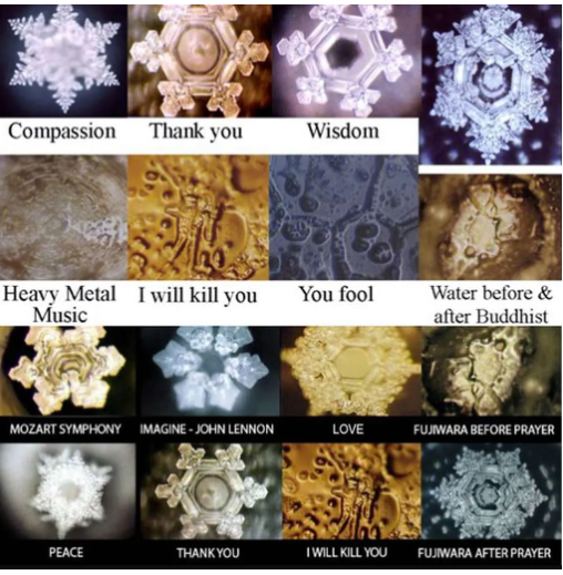 Emoto’nun çalışmalarında ortaya çıkardığı su kristali fotoğraflarında, altlarında yazan cümlelere maruz bırakıldığı ve çalışma sonucunda iyi ya da kötü söylemlere göre şekil aldığı belirtiliyor.
