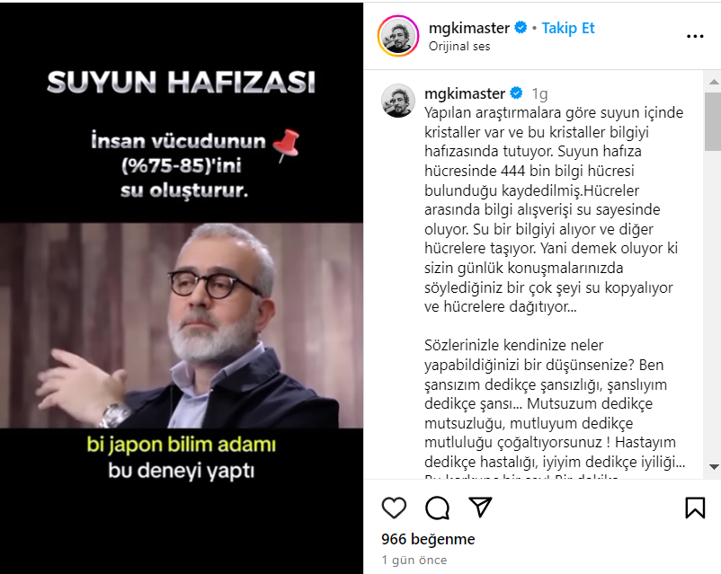 Paylaşımların dayanağının olup olmadığını öğrenmek için araştırmaya başlıyoruz. Öncelikle Masaru Emoto’nun, Uluslararası İlişkiler eğitimi ve alternatif tıp doktoru sertifikası bulunuyor. Emoto, su kavramı ve suyun gizemi hakkında çalışmış ve kitaplarında da güzel müziğin, olumlu düşünmenin, iyi konuşmanın su üzerinde etkili olduğuna ve mesajlar verdiğine dair yıllardır konuşulan bu teorilerden bahsetmiş.