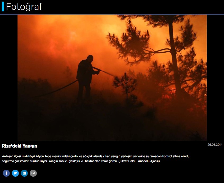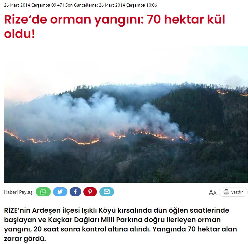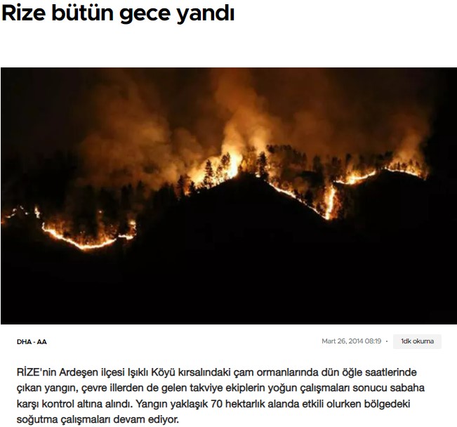 İddia fotoğraflarında yer alan orman yangını görselini incelediğimizde ise, 25 Mart 2014 tarihinde Rize’nin Ardeşen ilçesindeki Işıklı Köyü’nde çıkan orman yangınında 70 hektar alanın zarar görmesiyle sonuçlanan haberlere ulaşıyoruz.
