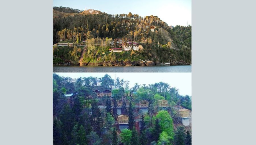 Söz konusu fotoğrafları tersine görsel arama yöntemi yardımıyla taradığımızda, paylaşılan fotoğrafın altında görülen evlerin, Çamburnu Tabiat Parkı’nda yer alan Hancıoğlu Çamburnu Orman Evleri’nin inşaat halinde olan görüntüsü olduğu sonucuna ulaşılıyor.