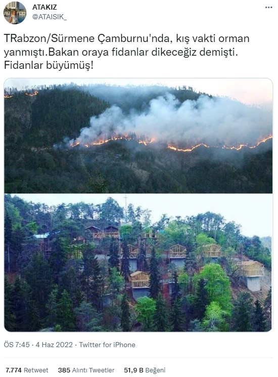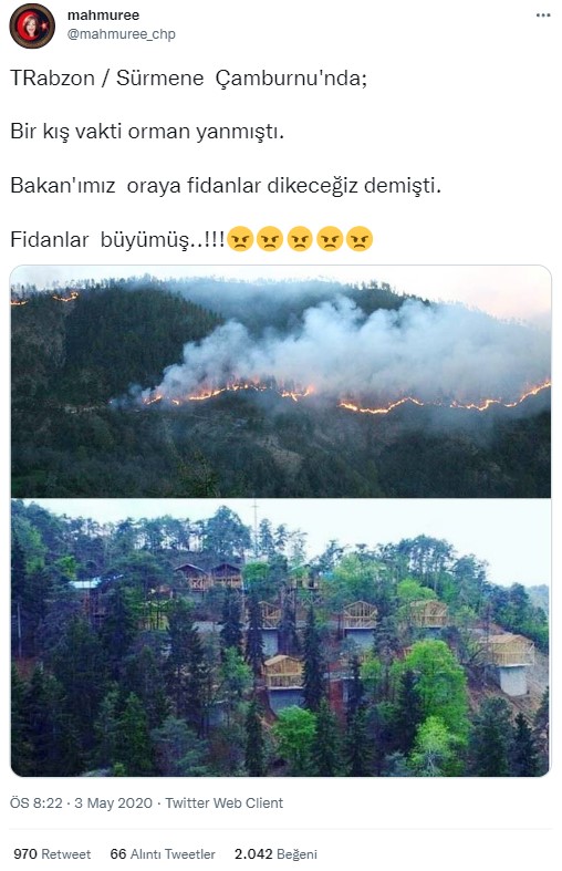 Sosyal medyada geçtiğimiz günlerde gündeme taşınan bir söylem doğrultusunda, Trabzon Sürmene Çamburnu’nda yanan ormana villa inşaatı yapıldığı iddia edildi. Aynı söylemle sosyal medyada paylaşılan gönderiler, 2019 yılına kadar uzanıyor. Paylaşım yorumlarına bakıldığında, “TRabzon/Sürmene Çamburnu’nda, kış vakti orman yanmıştı.Bakan oraya fidanlar dikeceğiz demişti. Fidanlar büyümüş!” şeklinde bir ifadeye yer verildiği görülüyor.
