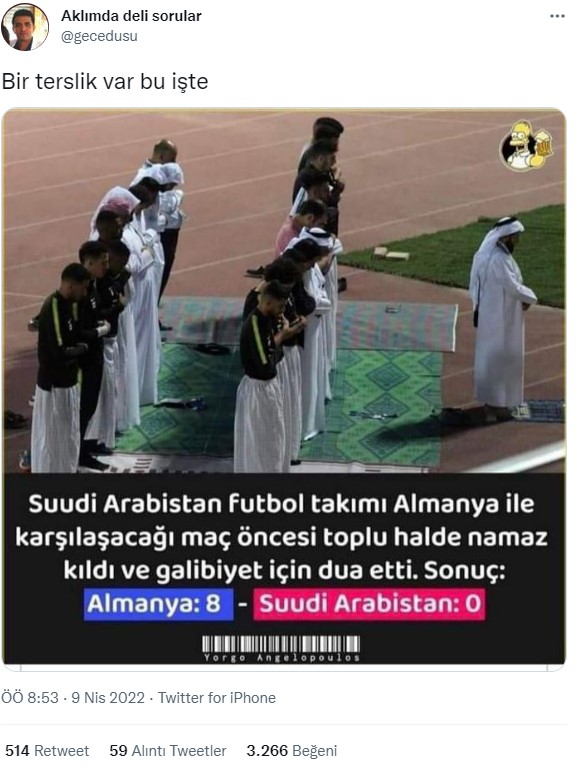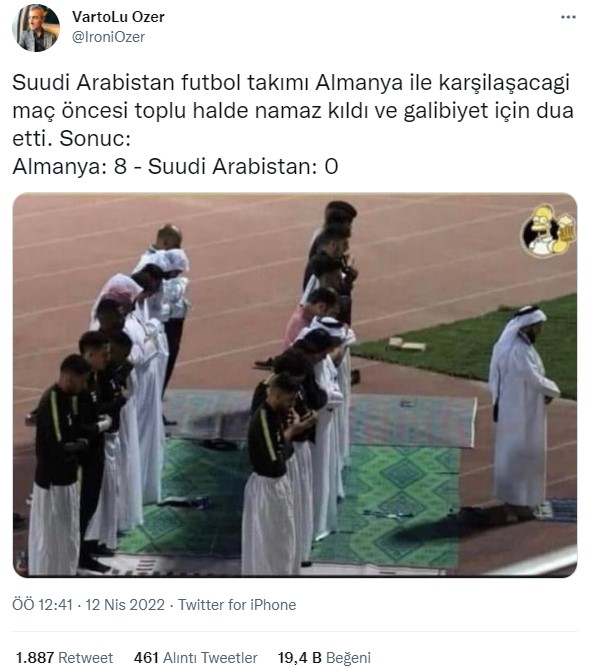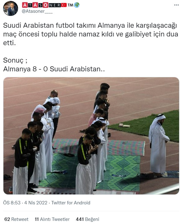 Bu paylaşımda Almanya ile yapılacak maç öncesinde Suudi Arabistanlı futbolcuların saha kenarında ibadet ettiğine dair bilgiler yer alıyor. Maç sonucunun da bilgisine yer verilen paylaşımlarda, Almanya’nın 8-0 Suudi Arabistan’ı yendiği söyleniyor.